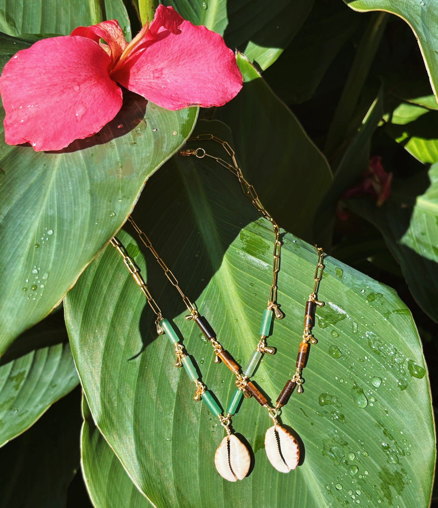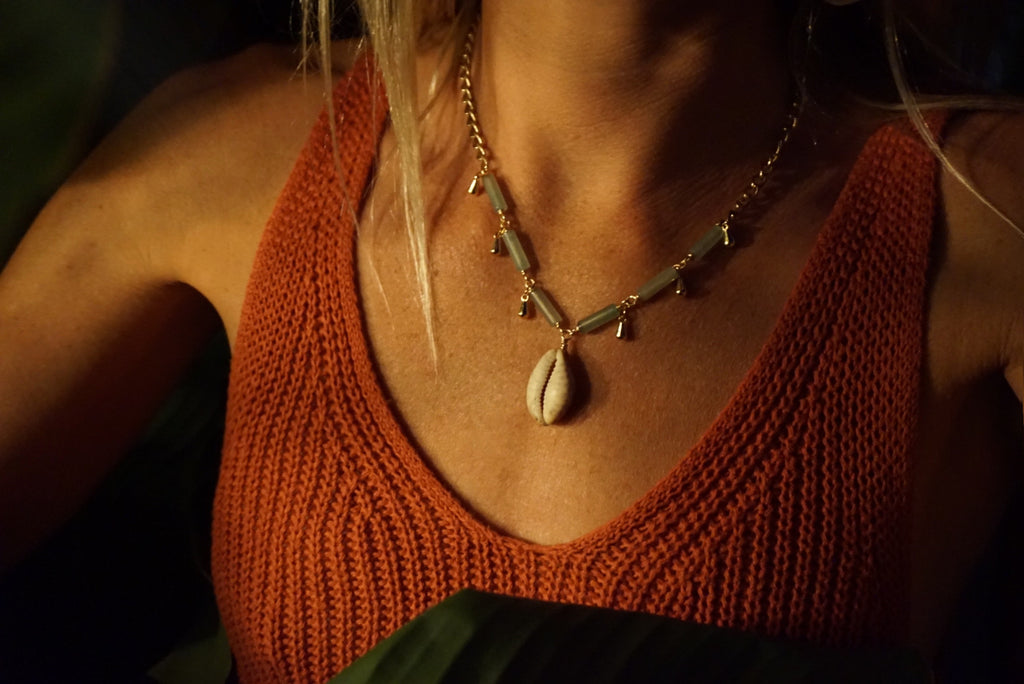 The Coastal Cowrie necklace, with shells handpicked with care from the beautiful beaches of Costa Rica, feels like the quiet coastlines lined with lush palm trees that meet the ocean's edge.